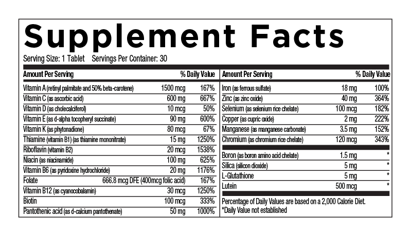 Look good and feel great with this adult multivitamin for active men and women. Its multi-antioxidant formula supports immunity and is designed to help promote healthy circulation, vision, and body tissue.* It also offers energy support and works to help maintain optimal strength and overall wellness.* This high-potency** formula is crafted to provide supplemental support that may be difficult to obtain from food alone. The ingredients in this multivitamin help support eye health as you age, while also encouraging healthy circulation and assisting with normal tissue regeneration.* With more Lutein than many competitors, this multivitamin doubles as an eye-health supplement to help deliver vision support.* It also includes Vitamin K to help support bone health and circulatory function, along with L-Glutathione, which helps support the blood and liver and serves as an immunity aid.* The formula includes 100% of your daily value of Iron (18 mg).*